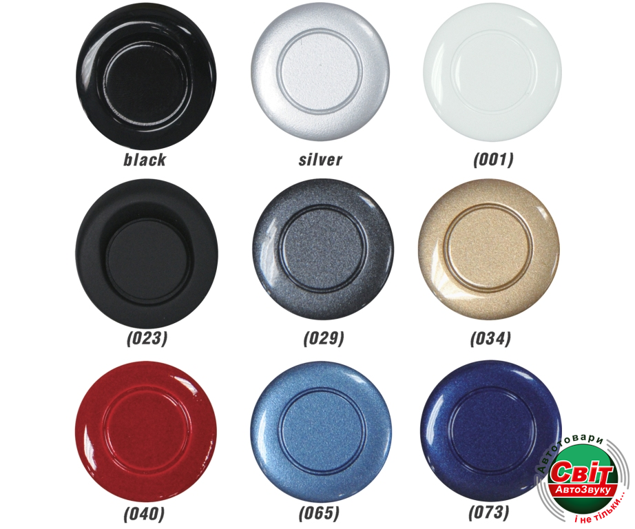 Крім чорних і сріблястих комплекти можна укомплектувати кольоровими датчиками. Головне, що треба мати на увазі, що навряд чи колір датчика підійде на 100% по відтінку до кольору автомобіля. Саме тому стандартні кольори це чорний (класика жанру) і сріблястий (там, де чорний не підходить).