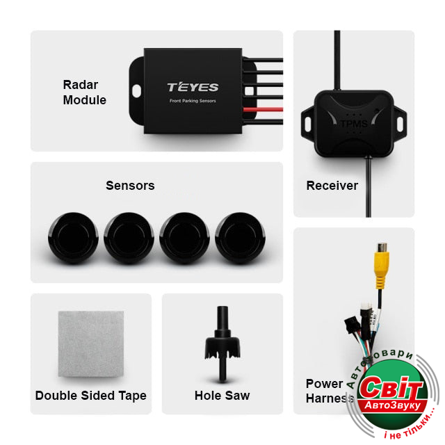 Паркувальний радар для переднього бамперу Teyes R1Teyes R1 - це універсальний передній парктронік на 4 датчики з можливістю виведення інформації на екран магнітоли Teyes, який відрізняється точністю вимірювання відстані до перешкоди, можливістю розпізнавання сліпих зон та високою швидкістю роботи.
