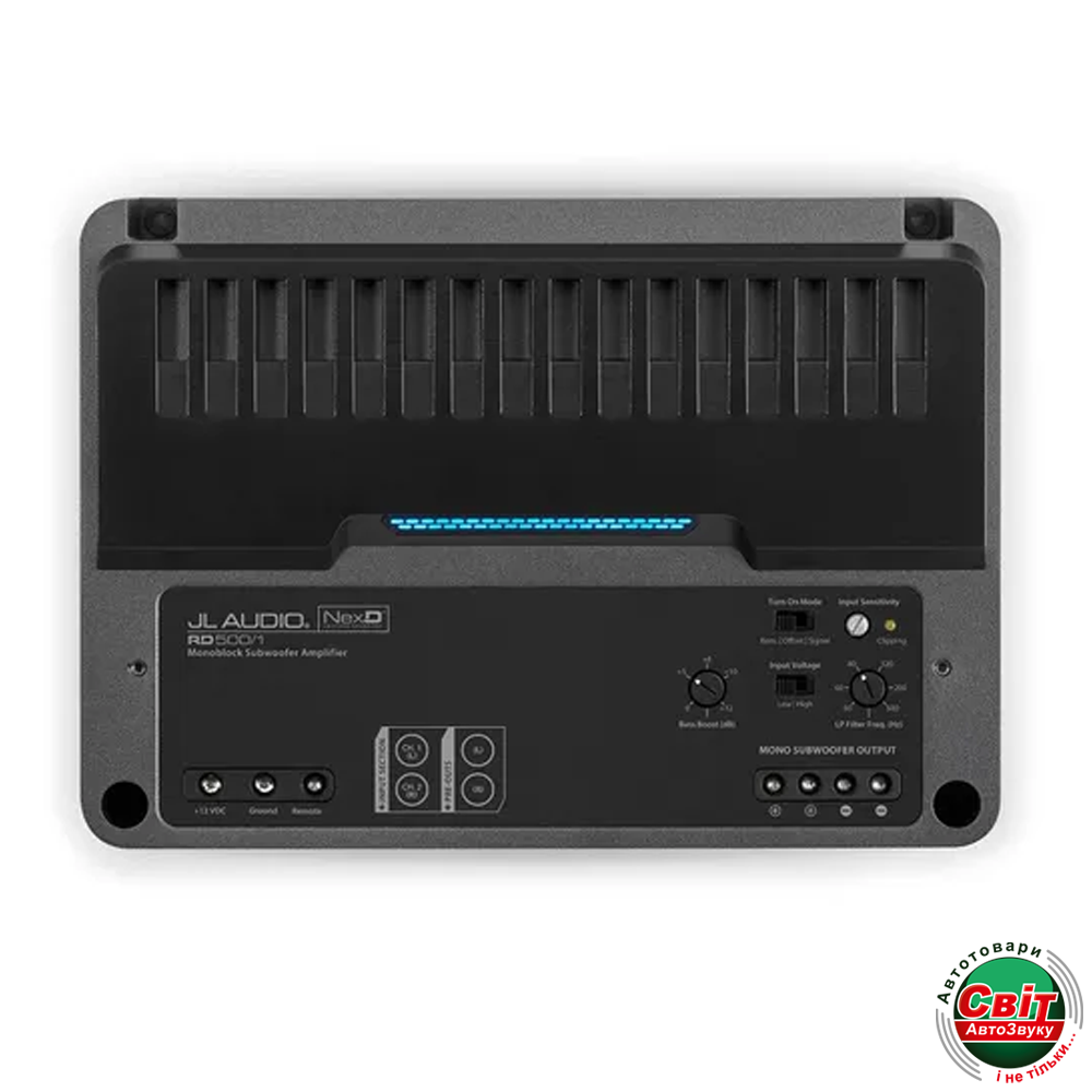 Підсилювач JL Audio RD500/1Монопідсилювач JL Audio RD500/1 буде забезпечувати ваш сабвуфер потужністю до 500 Вт RMS, так що ви будете чути та відчувати баси чітко на тлі свисту вітру та гуркоту дороги. Додатковий дротовий пульт дистанційного керування дозволяє регулювати гучність сабвуфера з переднього сидіння.