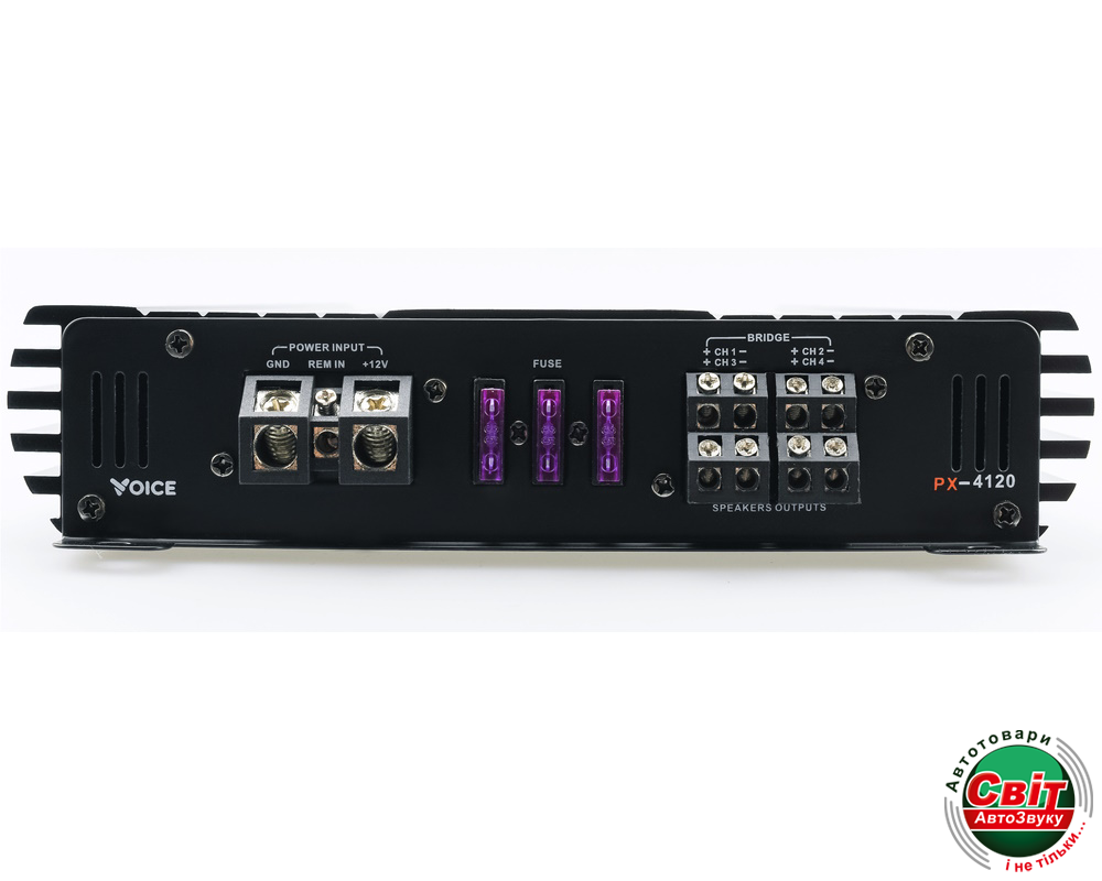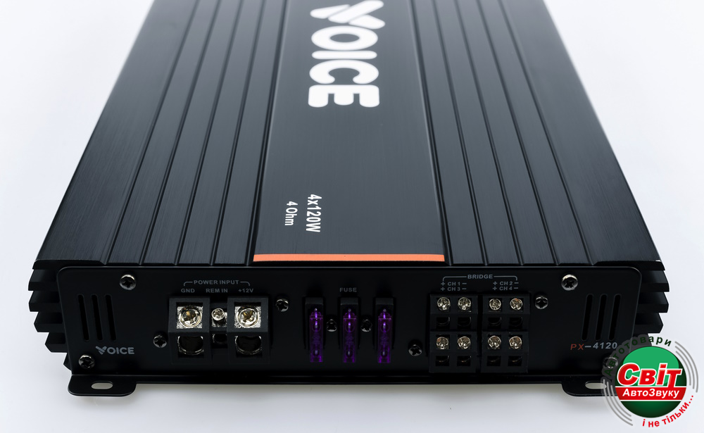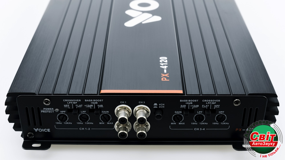 Підсилювач Voice PX-4120Підсилювачі VOICE є надійним рішенням для тих, хто цінує потужний і чистий звук в автомобільній аудіосистемі. Він забезпечує стабільну роботу при навантаженні 2 Ома на кожному каналі або підключенні в "мостовому режимі" для роботи в 4 Ома, що дозволяє отримати максимальну потужність без втрати якості.