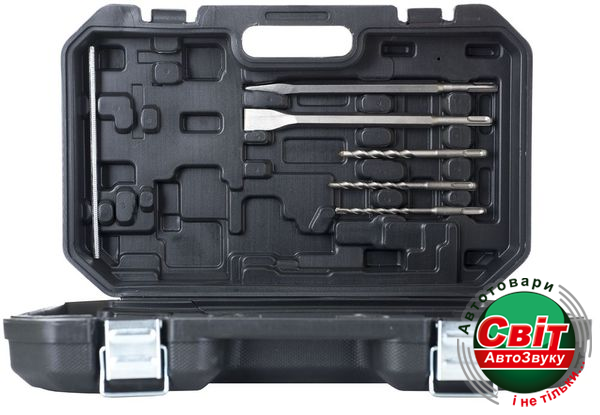 Перфоратор, металлический ограничитель глубины сверления, 3 бура, зубило плоское, зубило пикообразное, инструкция и гарантийный талон, запасные карбоновые щетки, пластиковый кейс.