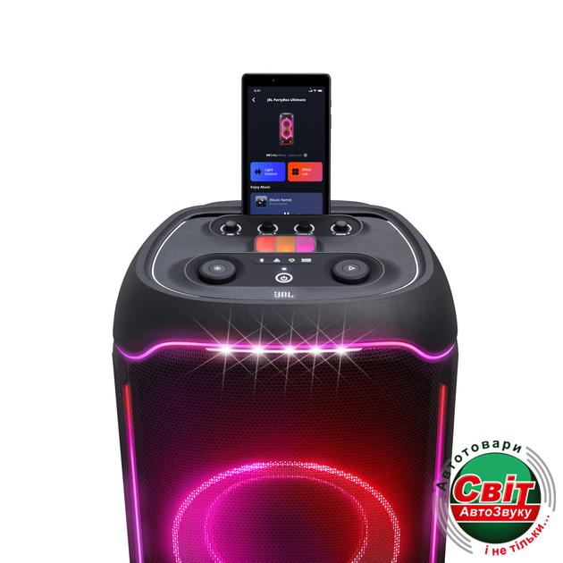 Пристрій обладнано масштабною системою різнокольорових діодних підсвічувань. Локація для вашої вечірки перетвориться на атмосферний простір, наповнений вражаючим саундом і багатовимірними світловими ефектами. Стробоскопи, світлові доріжки, ефект зоряної ночі синхронізуються з вашою музикою. Просте управління підсвічуванням здійснюється в один клік на верхній панелі акустики JBL PartyBox Ultimate або через мобільний додаток JBL One.