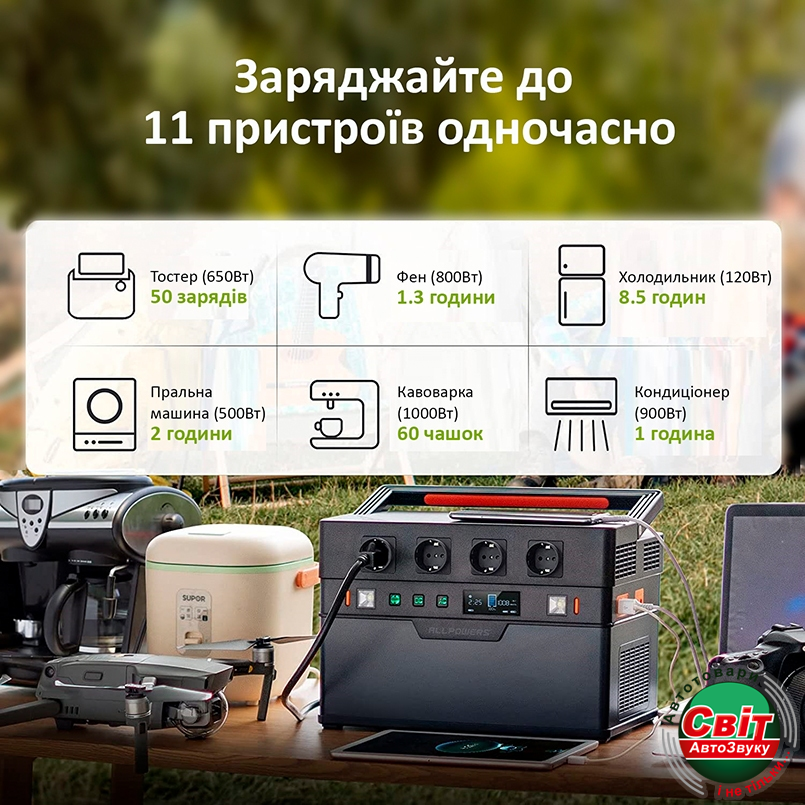 - Живлення до 11 пристроїв одночасно: з більшою потужністю 1500 Вт і більшою ємністю 1092 Вт-год, ALLPOWERS S1500 має 4 стандартні розетки змінного струму PURE SINE WAVE, які забезпечують додаткову потужність для живлення більше приладів змінного струму одночасно. 1*USB-C (PD 100 Вт), 3*USB-A, 2 DC і 1 стандартний автомобільний порт можуть ефективно заряджати всі ваші маленькі цифрові пристрої, як-от комп’ютери, планшети та телефони.