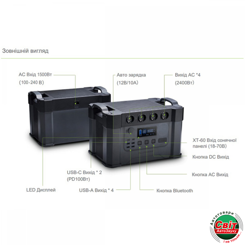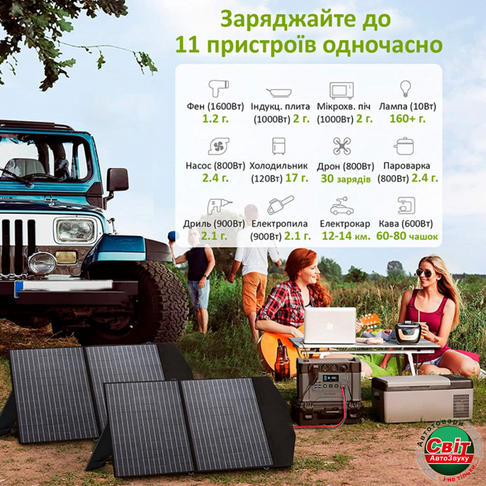 - сонячна панель (XT60 18-70В MPPT 650Вт Maкс) - Час заряджання станції:- AC100-240В - 3,8 год;