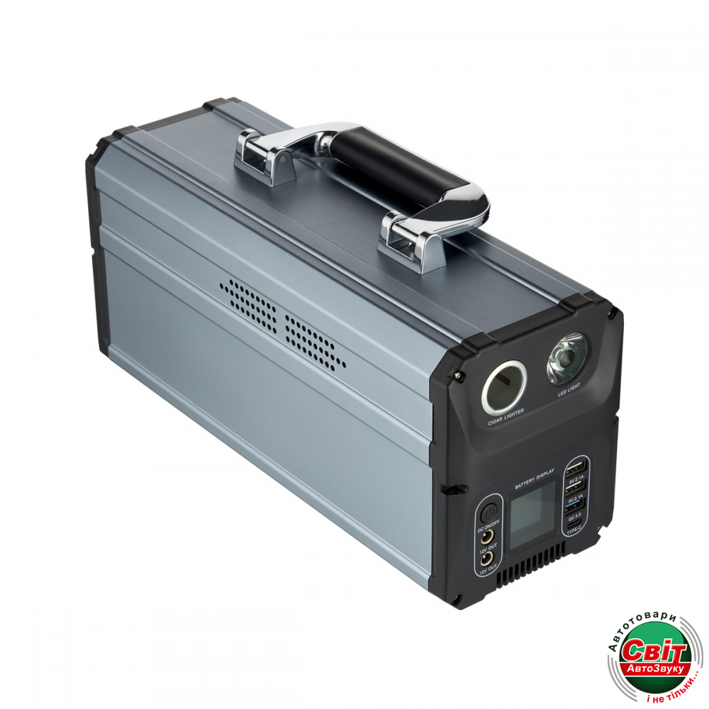 - Роз’єми: 2 USB 5V 2,1A, 1 USB QC3.0 quick charge (5V/2.4A,9V/2.0A,12V/1.5A), 1 Type-C (5V/2.4A,9V/2.0A,12V/1.5A), 2 виходи 12V DC, 10A max, вихід гніздо прикурювача 12V, вхід DC для заряджання