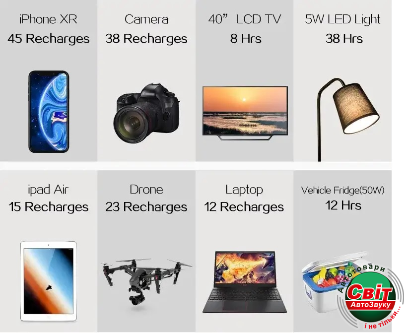 • Роз’єми: 2 USB 5V 2,1A (3,1A max), 1 USB QC3.0 quick charge (5V/2.4A, 9V/2.0A, 12V/1.5A), 1 Type-C (5V/2.4A, 9V/2.0A, 12V/1.5A), вихід 12V DC, 10A max, вихід гніздо прикурювача 12V, вхід DC для заряджання