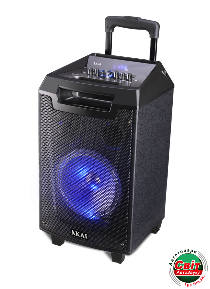— 8-дюймовый вуфер + 3-дюймовый твитер;— аудиовход / выход;— аккумулятор: 12В 3 Ач;— беспроводной микрофон;— диско подсветка.