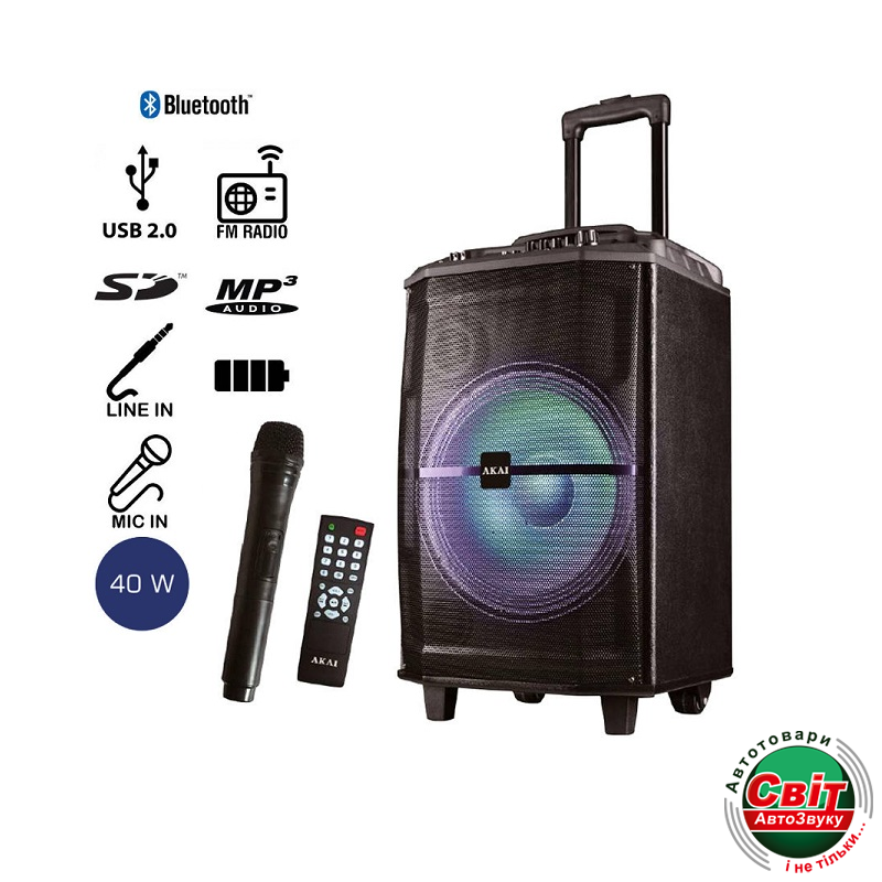 Портативна акустична система Akai ABTS-H12LПортативна акустична система Akai ABTS-H12L. Начните вечеринку с караоке! Портативная колонка имеет два динамика размером 12″ и 3″, а также СВЕТОДИОДНОЕ освещение в стиле диско. Функция караоке (микрофон входит в комплект). Возможность управления с помощью прилагаемого пульта дистанционного управления. Мощность динамика, которую услышит каждый!