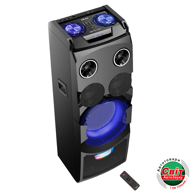 Портативна акустична система Akai ABTS-W5Акустична система AKAI ABTS-W5 имеет мощный звук благодаря высококачественным встроенным динамикам с общей среднеквадратичной мощностью 50 Вт. Музыка дополняется световым шоу и большим сабвуфером. Звук устройства можно регулировать благодаря эквалайзеру. В верхней части корпуса колонки находится кнопки и поворотный регулятор, а для того, чтобы хорошо работать с устройством даже в темноте, клавиши регулировки громкости имеют подсветку.