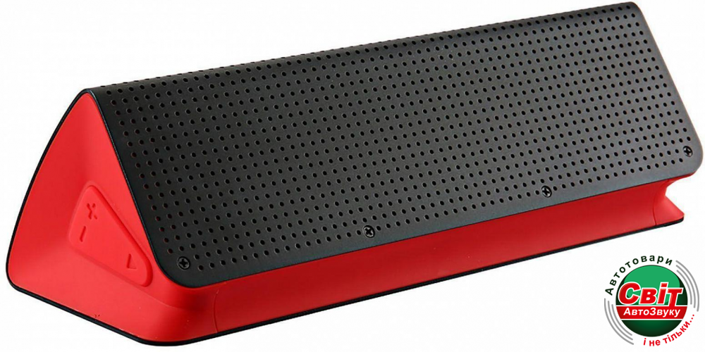 Продолговатый треугольный металлический корпус 198x85x65 мм. выглядит стильно и целостно. На его торцах можно найти кнопку питания, регулировки громкости и воспроизведения.