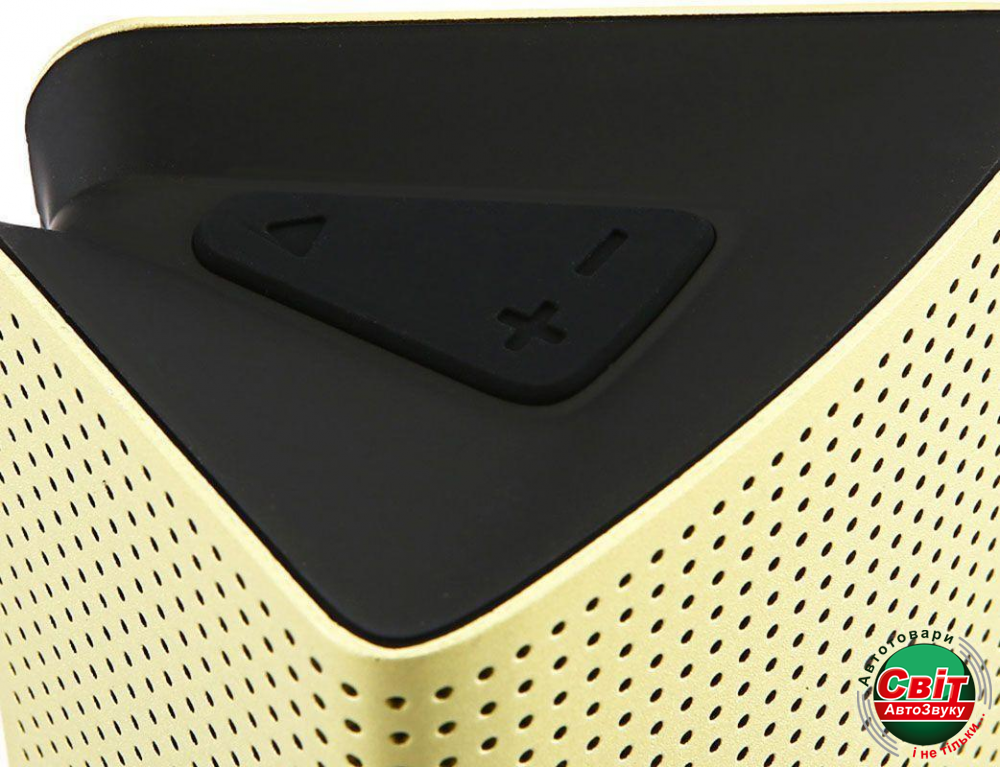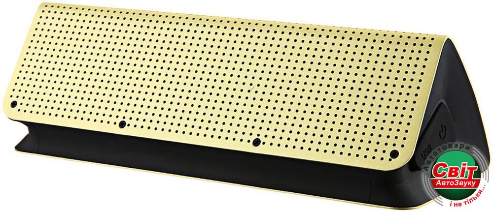Продолговатый треугольный металлический корпус 198x85x65 мм. выглядит стильно и целостно. На его торцах можно найти кнопку питания, регулировки громкости и воспроизведения.