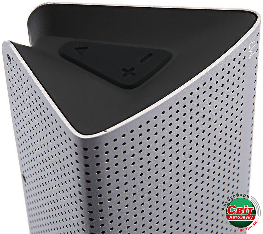 Продолговатый треугольный металлический корпус 198x85x65 мм. выглядит стильно и целостно. На его торцах можно найти кнопку питания, регулировки громкости и воспроизведения.