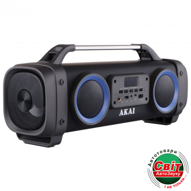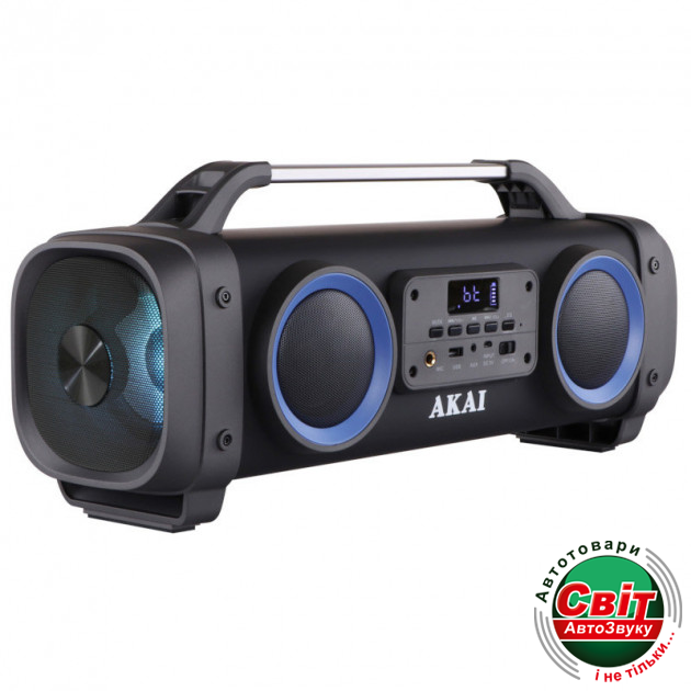 Портативна колонка Akai ABTS-SH02Мощная портативная Bluetooth колонка AKAI ABTS-SH02 с 2 твитерами и 2 сабвуферами светодиодной подсветкой. Забудьте про провода! Благодаря технологии Bluetooth данная колонка подключается по беспроводной связи к любому устройству с функцией Bluetooth, например ноутбуку или стационарному компьютеру, планшету или Вашему смартфону. Кроме того, перезаряжаемая литиевая батарея емкостью 3600 мАч обладает необходимой автономностью и обеспечивает около 2 часов воспроизведения на максимальной громкости. В комплект входит алюминиевая ручка для более удобного перемещения колонки. Эта портитивная колонка AKAI идеально подходит как для профессиональных музыкантов, так и для повседневного домашнего прослушивания музыки.