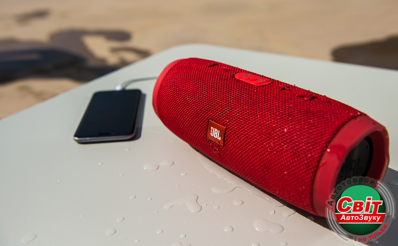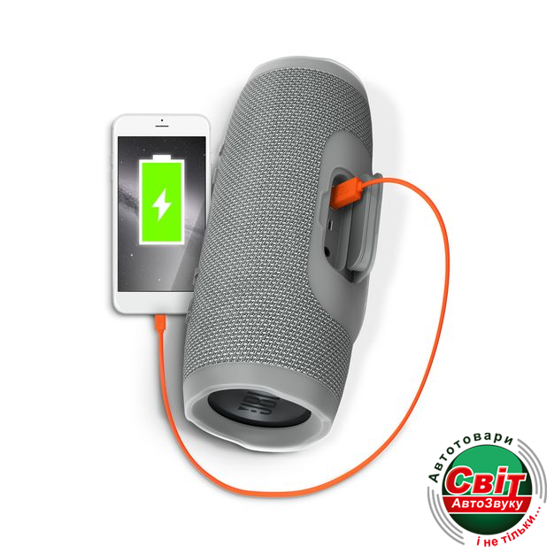 Оригинальная портативная колонка JBL Charge3 gray обладает мощным аккумулятором емкостью 6000mAh, который обеспечивает автономной работой до 15-ти часов. Во время работы акустической системы можно также зарядить смартфон или другое устройство благодаря наличию USB порта, который осуществляет зарядку подключаемых гаджетов.