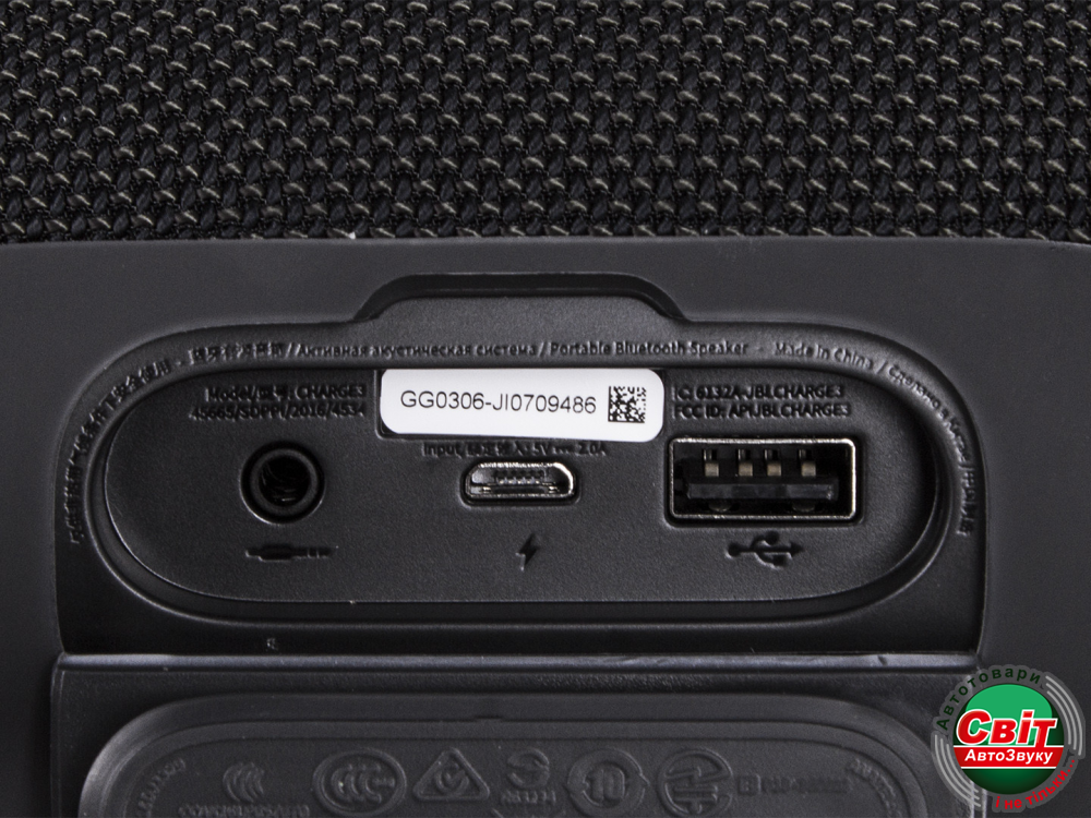 Оригинальная портативная колонка JBL Charge3 black обладает мощным аккумулятором емкостью 6000mAh, который обеспечивает автономной работой до 15-ти часов. Во время работы акустической системы можно также зарядить смартфон или другое устройство благодаря наличию USB порта, который осуществляет зарядку подключаемых гаджетов.