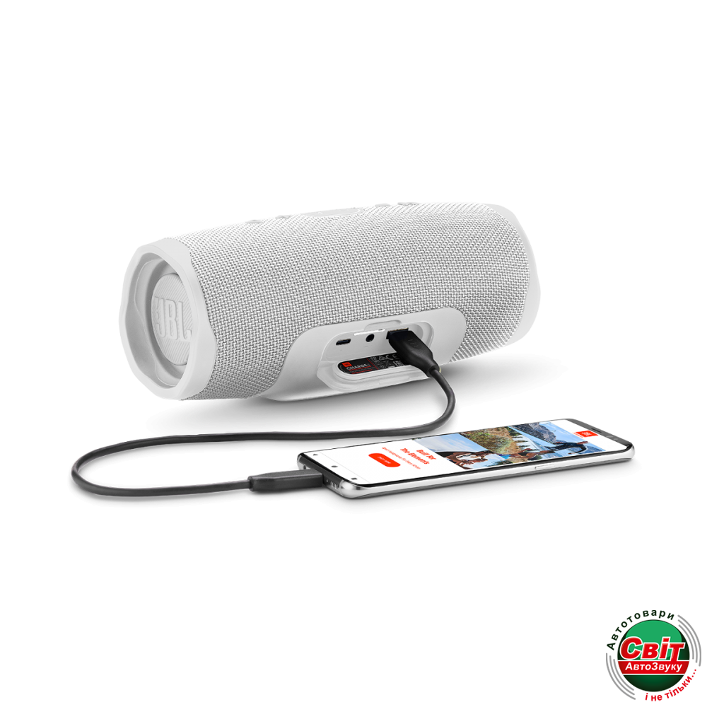 Портативна колонка JBL Charge 4 White (JBLCHARGE4WHT)BL Charge 4 бездротова портативна акустика з потужним звуком і ємною батареєю. Вона оснащена драйвером особливою, запатентованої конструкції, і двома басовими випромінювачами JBL, які роблять звук глибше і сильніше. Вбудований акумулятор на 7500 маг забезпечує колонці до 20 годин автономної роботи і дозволяє заряджати від неї інші мобільні гаджети, такі як телефон, планшет або плеєр. А міцний водонепроникний корпус робить Charge 4 ідеальним супутником на відпочинку, вечірці або в будь-якій поїздці.