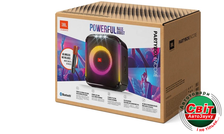 - Комплектація: 1 портативна колонка JBL PartyBox Encore, 1 радіомікрофон JBL, 1 кабель живлення від мережі, 1 керівництво користувача, 1 інструкція з безпеки, 1 гарантійний талон
