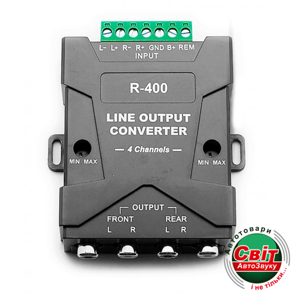 4-х канальний конвертер рівня аудіосигналу призначений для з'єднання головних пристроїв автомобілів, які не мають лінійних виходів, через акустичні високочастотні виходи до стандартних низькочастотним RCA-входах підсилювачів.