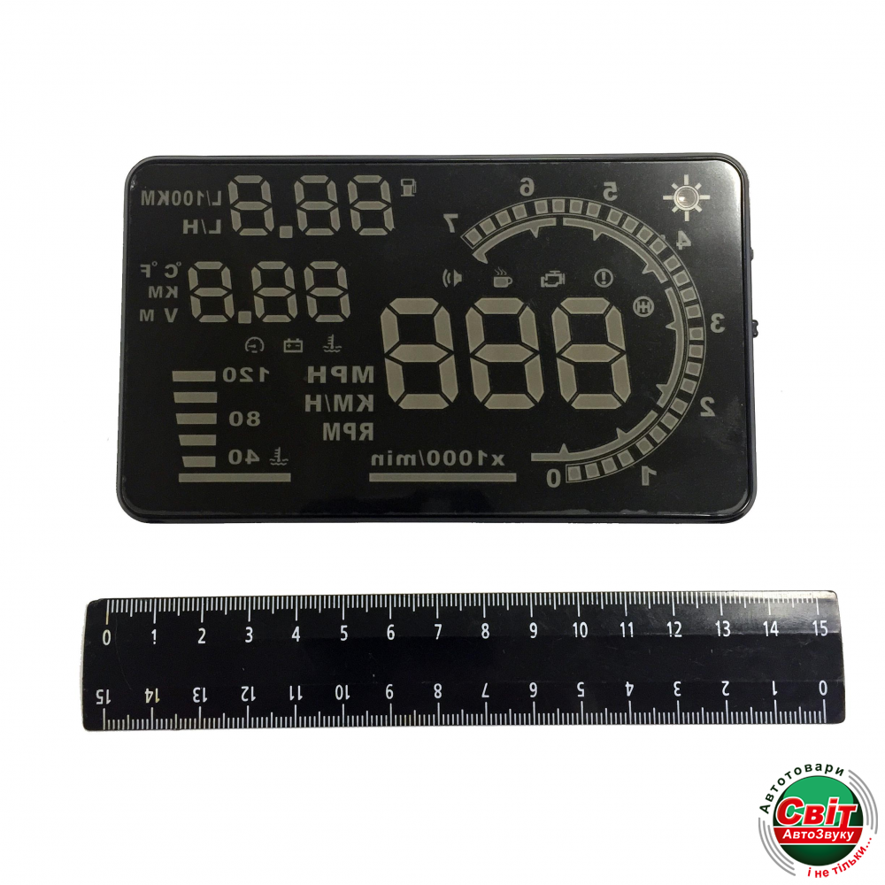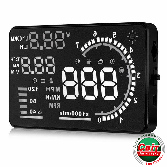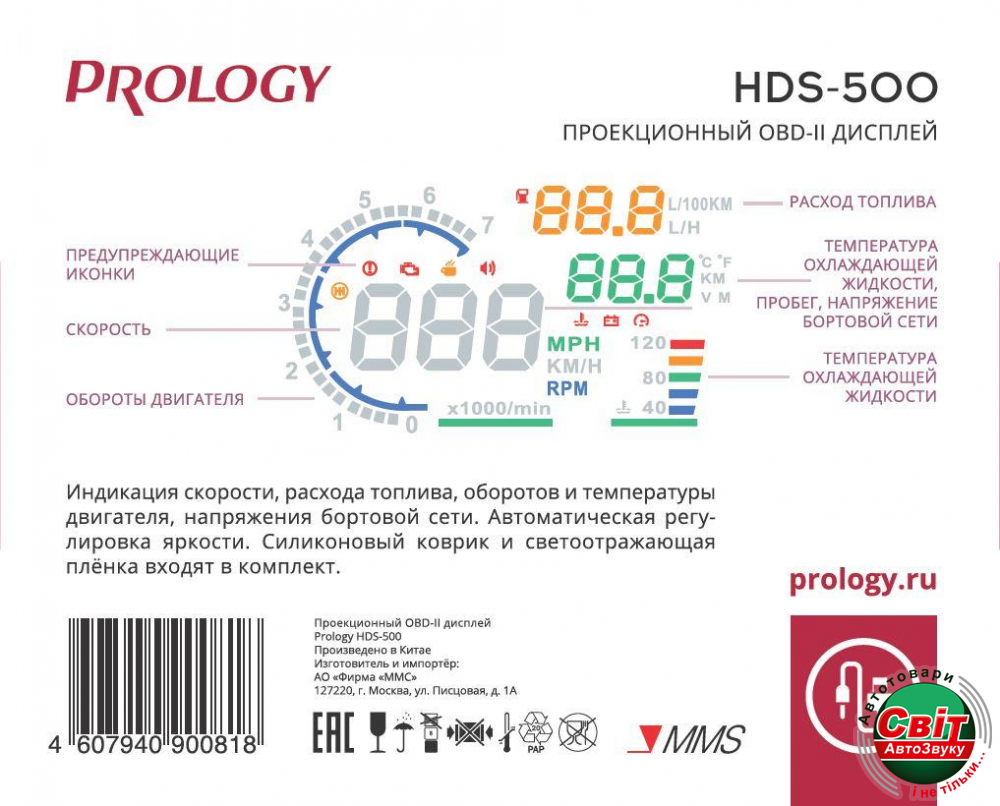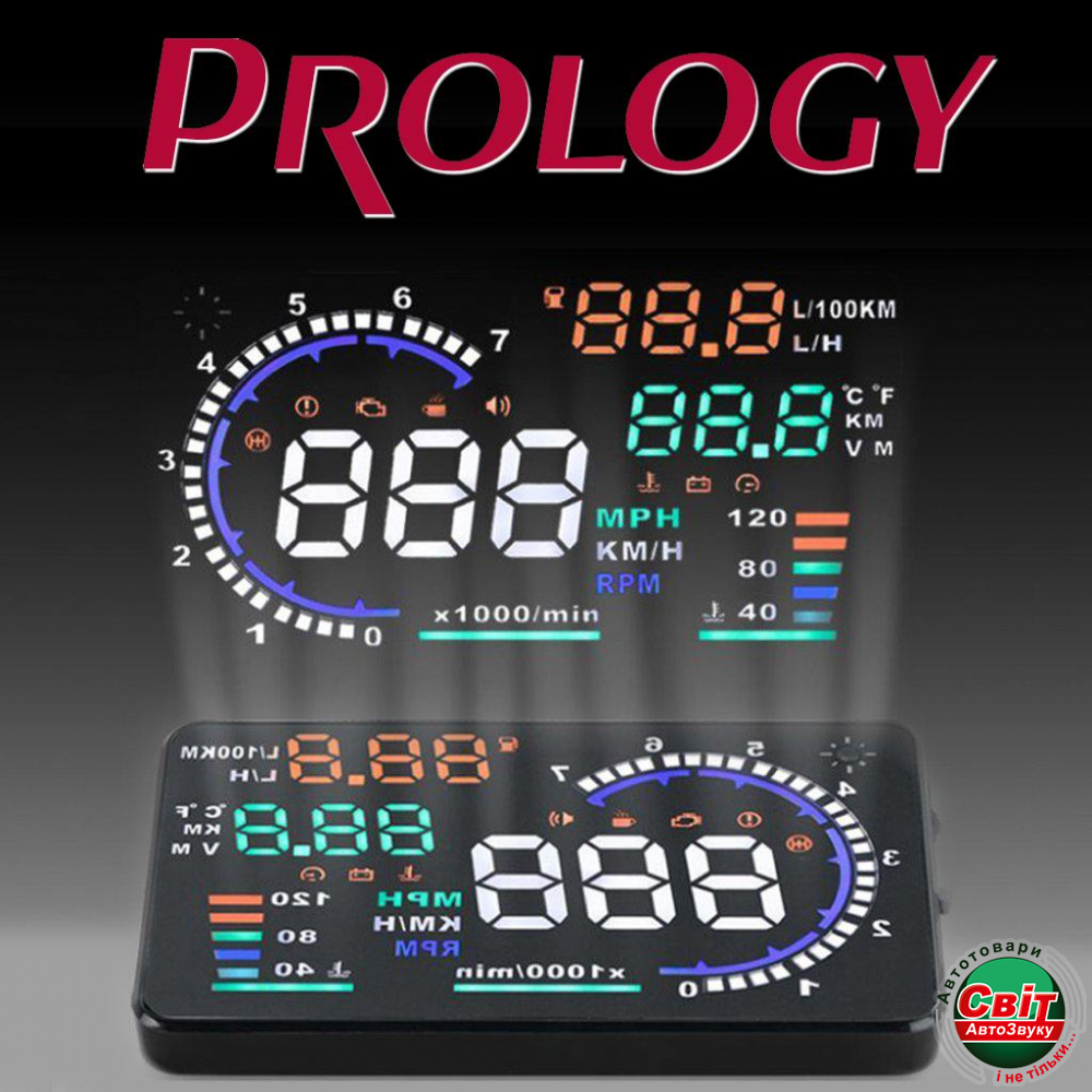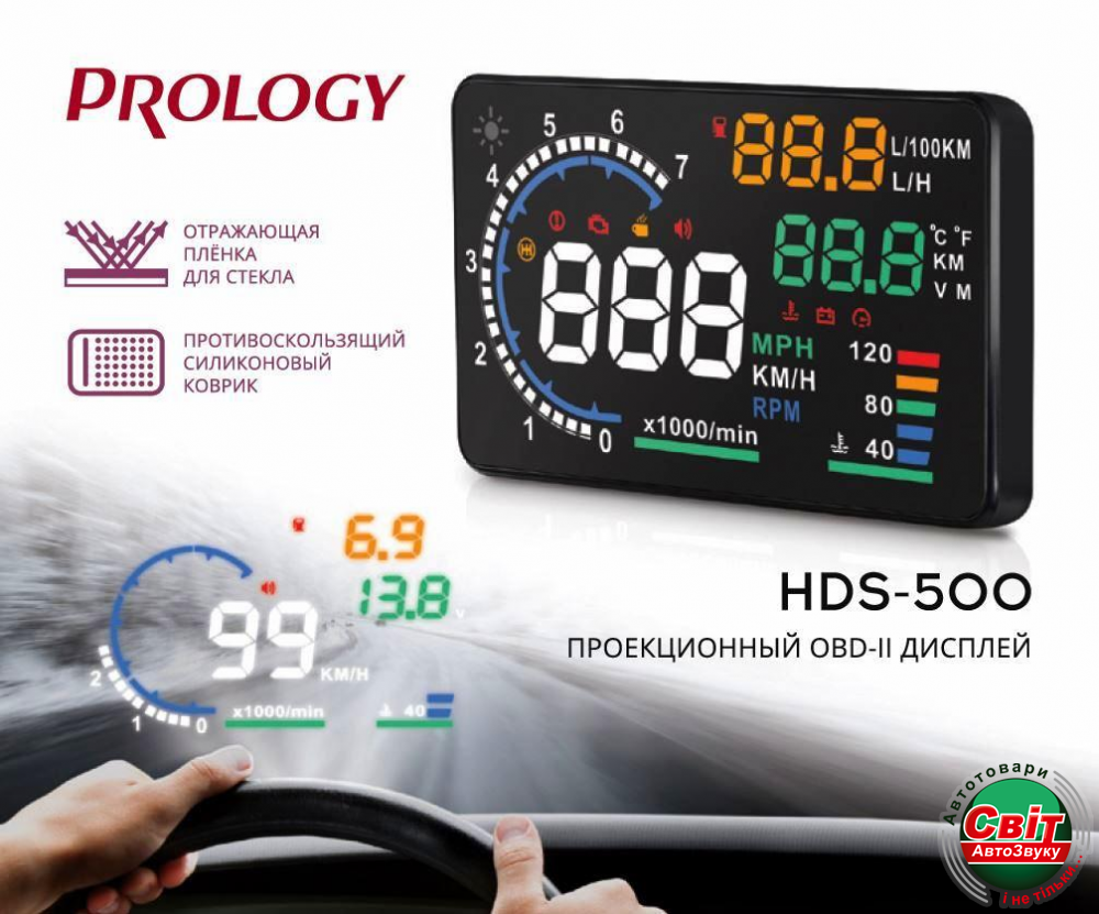 PROLOGY HDS-500 проецирует на лобовое стекло автомобиля или специальный плёночный экран актуальную информацию с бортового компьютера, которая располагается на линии взгляда водителя и позволяет ему не отвлекаться на приборную панель - вся необходимая информация у него прямо перед глазами.