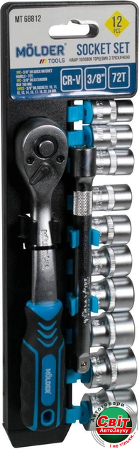 Набір торцевих головок з тріскачкою та подовжувачем MOLDER 3/8 12 предметів (MT68812). Професійний набір торцевих головок з тріскачкою та подовжувачем MOLDER