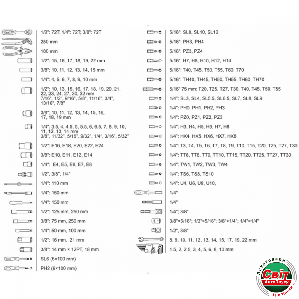 - Комбіновані ключі 11 шт: 8, 9, 10, 11, 12, 13, 14, 15, 17, 19, 22 мм
