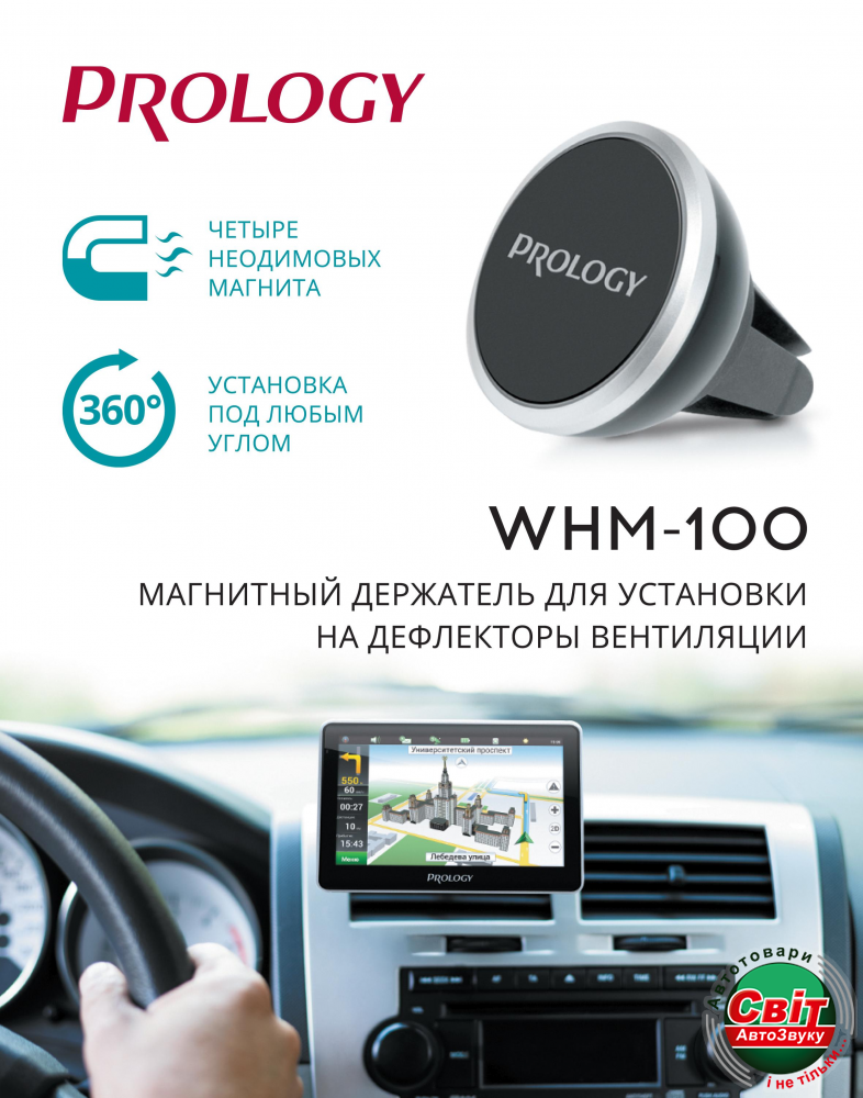 Автомобільний тримач Prology WHM-100Магнитный держатель PROLOGY WHM-100 предназначен для фиксации любых мобильных устройств весом до 1,5 кг на дефлекторе вентиляции в автомобиле.