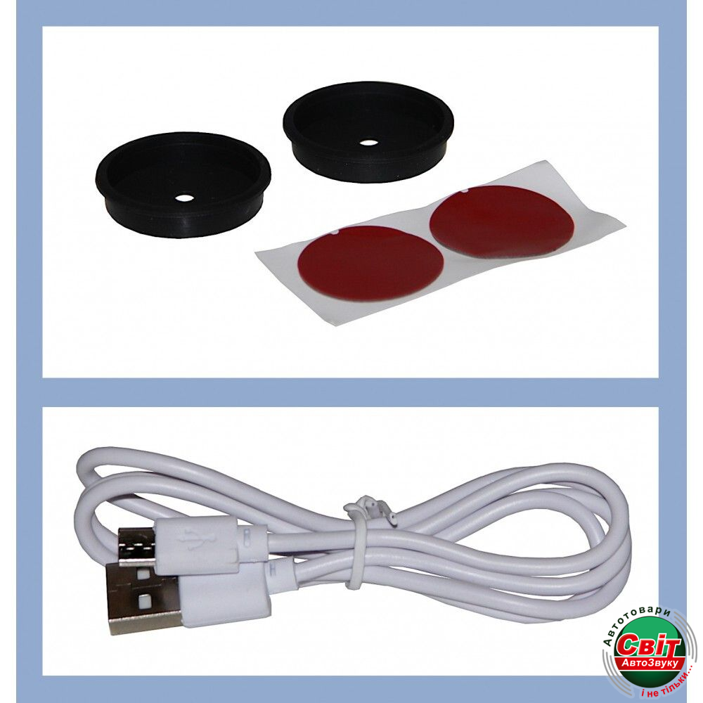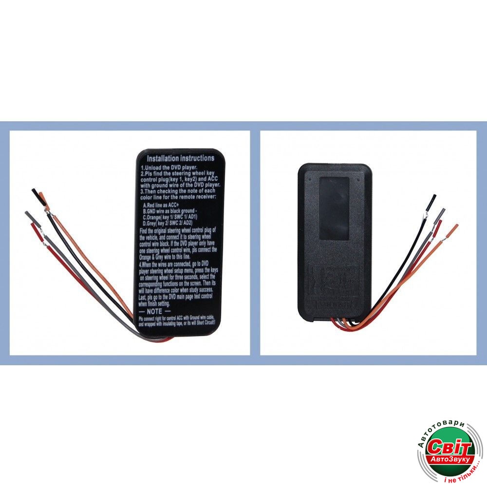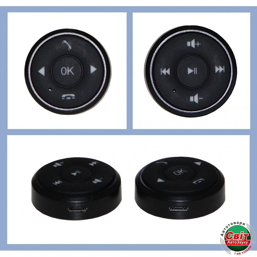 Універсальні бездротові кнопки управління магнітолою. Підключається до будь-яких магнітол з можливістю підключення кнопок управління керма або провідних пультів (є провід KEY1/KEY2). Має приємне синє підсвічування, яке активується при натисканні будь-якої кнопки і гасне через 5 секунд.