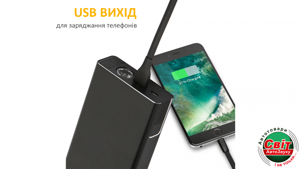 - Допоможе завести автомобіль в холодну пору року, а також при акумуляторі, що сів (розрядився), будь-які автомобілі з бензиновим двигуном 12В, об’ємом до 5.0 л. чи дизельні двигуни до 3.0л.