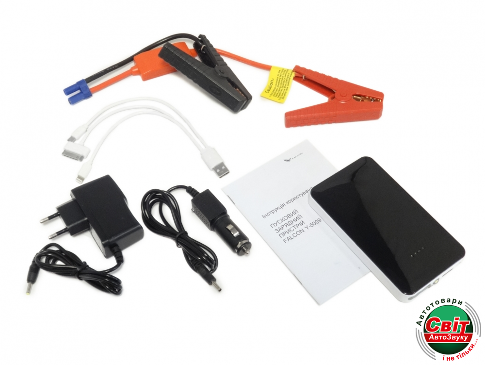 Пуско зарядний пристрій Falcon Y-5009Стартовый бустер Falcon Y-5009 – многофункциональное универсальное пуско-зарядное устройство, которое поможет запустить двигатель автомобиля при внезапном отказе штатного автомобильного аккумулятора в любом месте, в любое время, например, на сильном морозе или за городом.