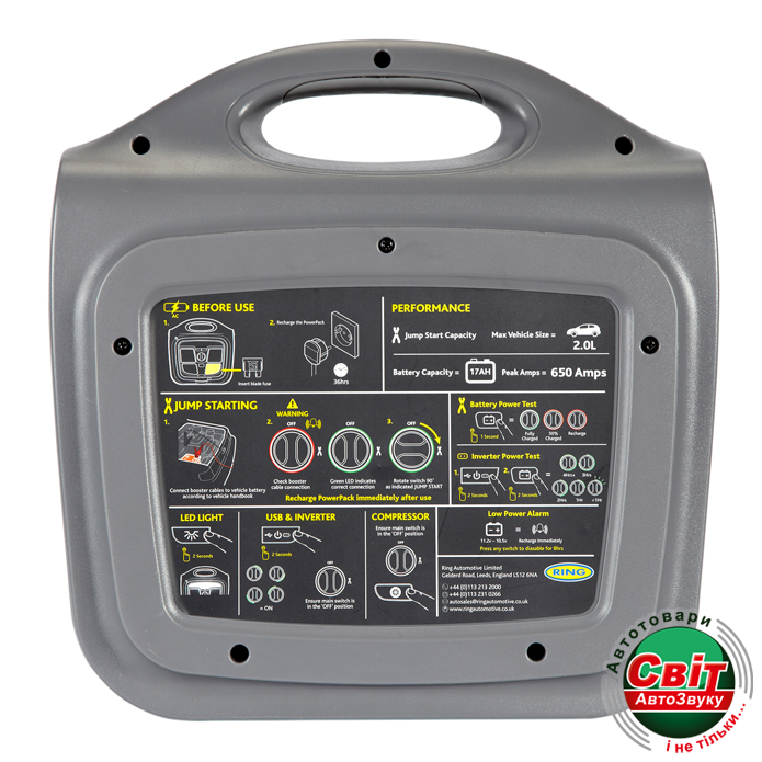 Пуско зарядний пристрій Ring REPP170 3in1 (+ компрессор + инвертор)Пусковое устройство + компрессор + инвертор 200W Power Pack 3in1 12В, 17А/h