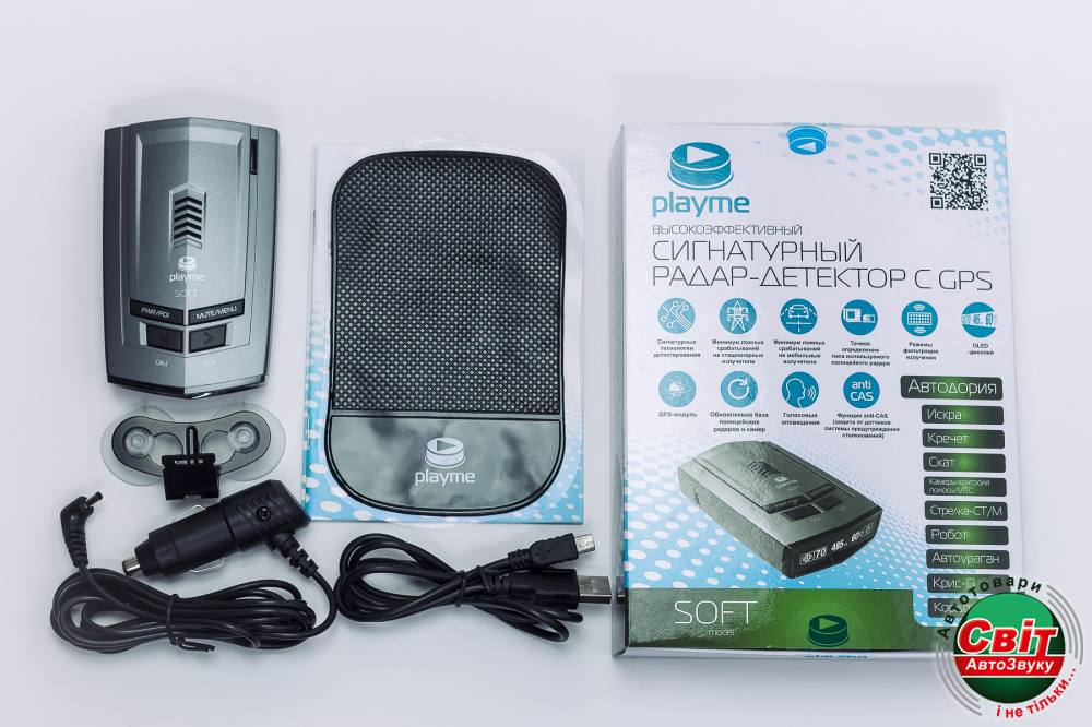Радар-детектор Playme SOFTPlayme SOFT — современный сигнатурный радар-детектор по доступной цене. Его мощный процессор анализирует сигналы по «подписи» (сигнатуре) и определяет модель радара. Такая система защищает Вас от ложных срабатываний. Новые сигнатуры загружаются в устройство через обновление прошивки, поэтому модель долго будет актуальной!