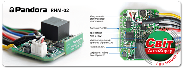 Pandora RHM-02 - Радіомодуль моторного відсікуСреди функциональных возможностей Pandora RHM-02: управление сиреной, контроль состояния концевика капота, датчик температуры двигателя, а также дополнительный аналоговый вход контроля сигнала тахометра, который будет полезен в тех автомобилях в которых тахосигнал необходимо брать либо с топливных форсунок, либо с системы зажигания. Кроме того, в модуле предусмотрен и специальный кодовый канал, который может управлять дополнительными устройствами — например модулем управления электромеханическим замком капота Pandora HM-05 или дополнительным цифровым проводным реле блокировки. Почему дополнительным? Да потому, что в Pandora RHM-02 есть собственное реле блокировки с максимальной нагрузкой в 20А и активацией по началу движения — внутри модуля интегрирован современный цифровой акселерометр, также практически полностью исключающий ложные срабатывания при работе системы запуска двигателя.
