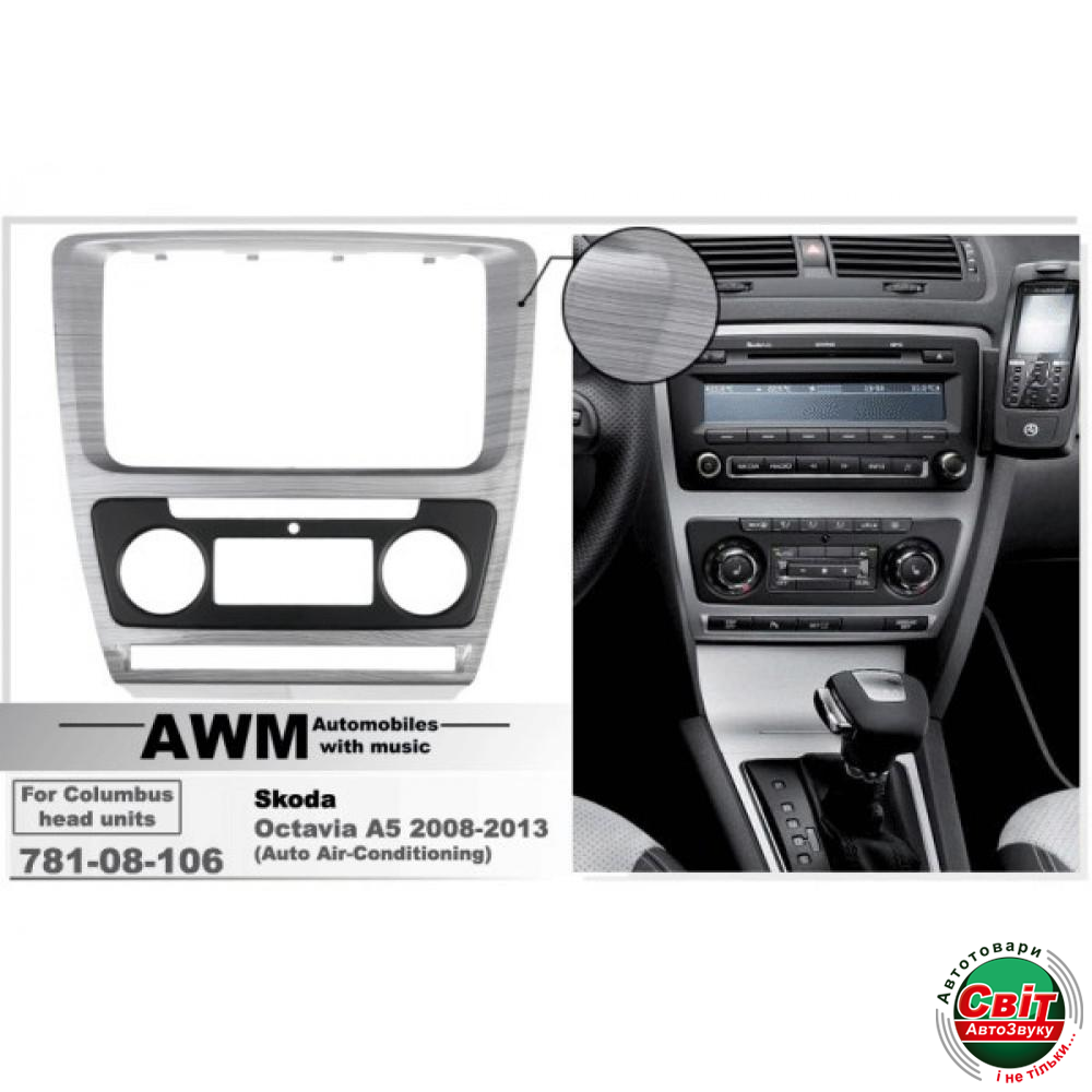 Рамка перехідна AWM 781-08-106 Skoda Octavia 2008-2013 (Auto Air Cond) Grey-HQПерехідна рамка від відомого виробника автомобільних аксесуарів - компанії AWM.