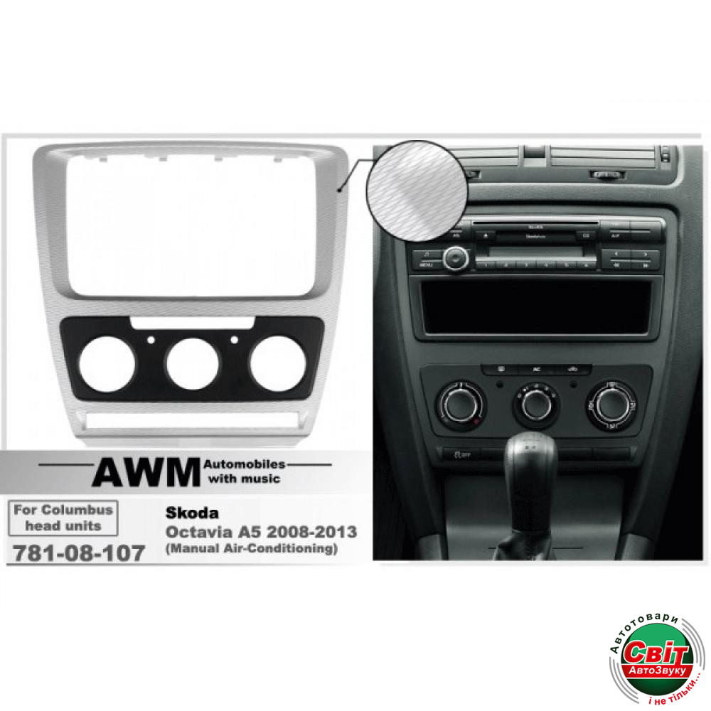 Рамка перехідна AWM 781-08-107 Skoda Octavia 2008-2013 (Manual Air-Cond) Silver-HQПереходная рамка от известного производителя автомобильных аксессуаров - компании AWM.