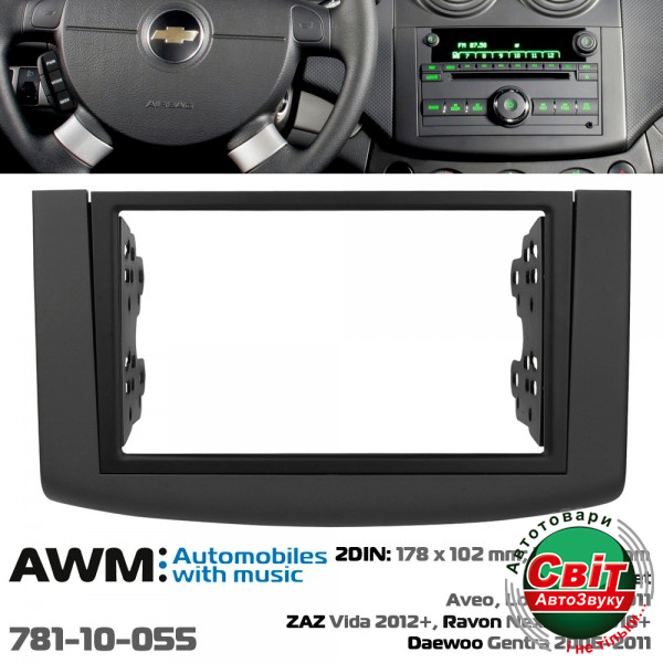Рамка перехідна AWM 781-10-055 Chevrolet Aveo, Daewoo Gentra, ZAZ VidaAWM 781-10-055: 2 DIN - 173 x 98 mm; 178 x 102 mm