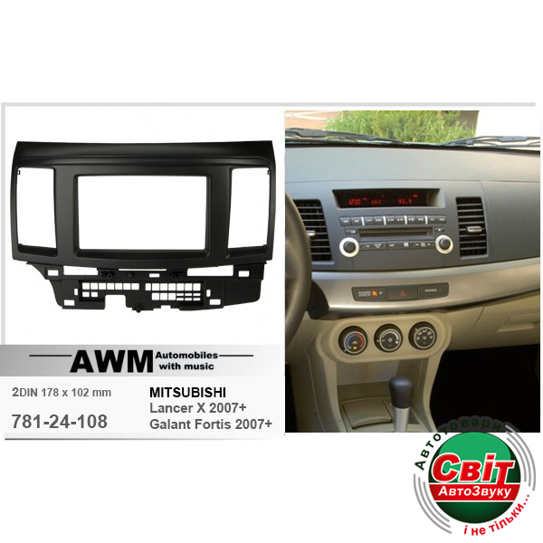 Рамка перехідна AWM 781-24-108 Mitsubishi Lancer XПереходная рамка для установки автомагнитолы: AWM 781-24-108:2 DIN - 178 x 102 mm;