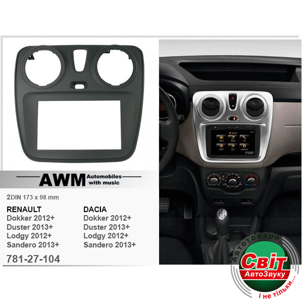 Рамка перехідна AWM 781-27-104 Renault, DaciaПереходная рамка для установки автомагнитолы: AWM 781-27-104: 2 DIN - 173 x 98 mm
