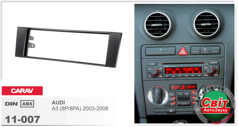 Рамка перехідна Carav 11-007 Audi A3 03-08 1DINПЕРЕХІДНА РАМКА ДЛЯ УСТАНОВКИ АВТОМАГНІТОЛИ CARAV 11-007: 1 DIN / 182 x 53 mm