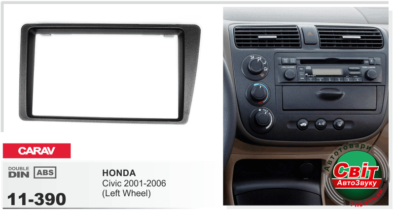 Рамка перехідна Carav 11-390 Honda Civic (01+) 2DINПЕРЕХІДНА РАМКА ДЛЯ УСТАНОВКИ АВТОМАГНІТОЛИ CARAV 11-390: 2 DIN / 173 x 98 мм / модель підходить тільки для а/м з кермом зліва