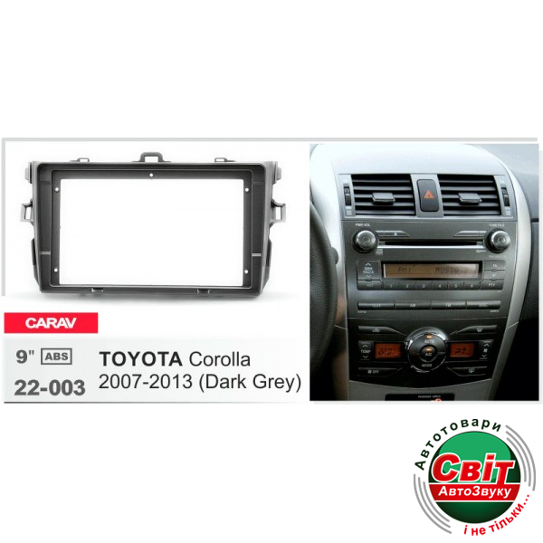 Рамка перехідна Carav 22-003 Toyota CorollaПерехідна рамка для установки автомагнітоли: CARAV 22-003: 9"- 230/220 х 130 mm