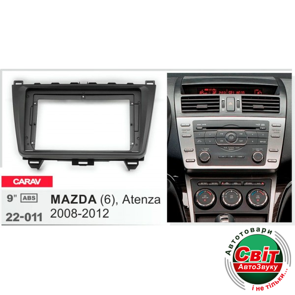Рамка перехідна Carav 22-011 Mazda 6, AtenzaПерехідна рамка для установки автомагнітоли: CARAV 22-011: 9" - 230/220 x 130 mm