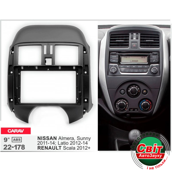 Рамка перехідна Carav 22-178 Nissan Almera, Sunny, Latio, Renault ScalaПереходная рамка для установки автомагнитолы: Carav 22-178: 9" - 230/220 х 130 mm
