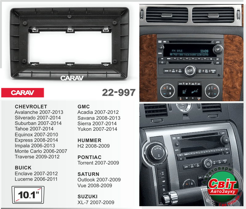 CARAV 22-997: 10.1" / 250:241 x 146 мм / CHEVROLET Avalanche 2007-2013; Suburban; Silverado, Tahoe 2007-2014; Equinox 2007-2010; Express 2008-2014; Impala 2006-2013; Monte Carlo 2006-2007; Traverse 2009-2012 / BUICK Enclave 2007-2012, Lucerne 2006-2011 / GMC Acadia 2007-2012; Savana 2008-2013; Sierra, Yukon 2007-2014 / HUMMER H2 2008-2009 / PONTIAC Torrent 2007-2009 / SATURN Outlook 2007-2009; Vue 2008-2009 / SUZUKI XL-7 2007-2009