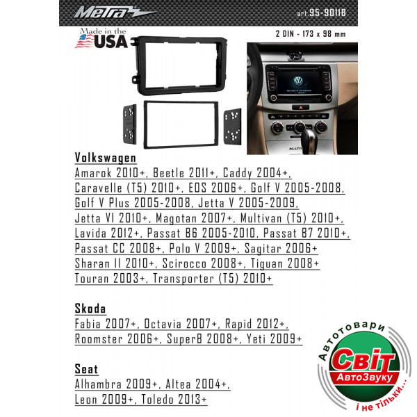 Рамка перехідна Metra 95-9011B Volkswagen Caddy, Golf, Jetta, Passat, Polo, Tiguan, TouranПереходная рамка для установки автомагнитолы: Metra 95-9011B: 2 DIN - 173 x 98 mm