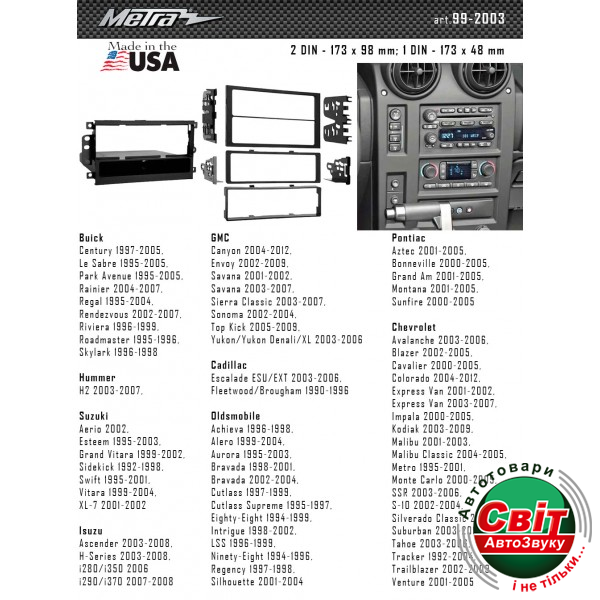 - ›Рамка перехідна Metra 99-2003 Suzuki, Chevrolet, Isuzu, Hammer, Pontiac, Cadillac