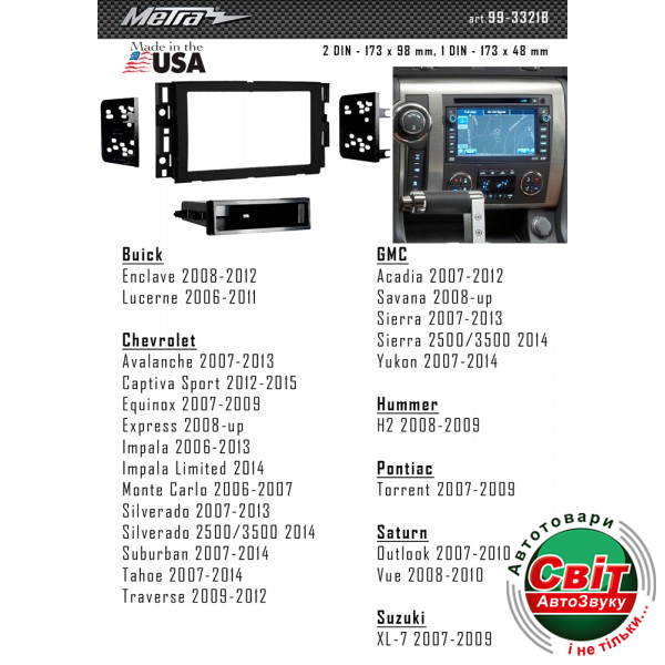 Рамка перехідна Metra 99-3321B Hummer, Chevrolet, SuzukiПереходная рамка для установки автомагнитолы: Metra 99-3321B: 2 DIN - 173 x 98 mm;