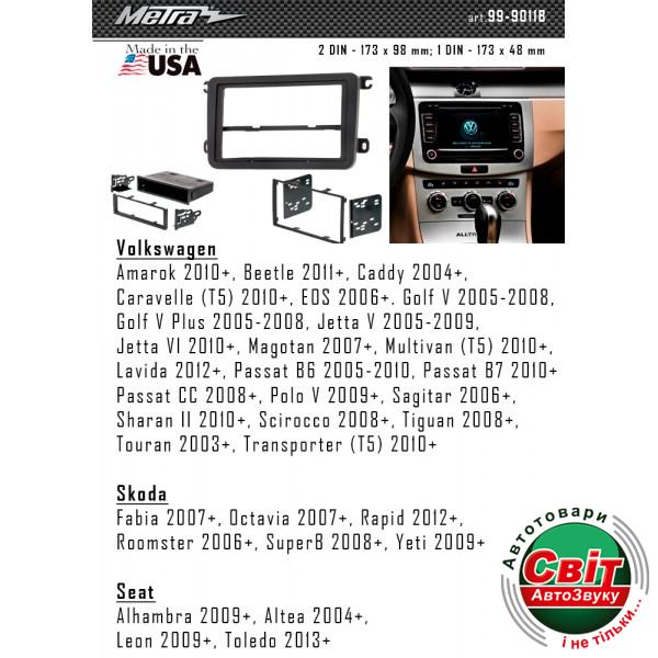 Рамка перехідна Metra 99-9011B Volkswagen Caddy, Golf, Jetta, Passat, Polo, Tiguan, TouranПереходная рамка для установки автомагнитолы: Metra 95-9011B: 2 DIN - 173 x 98 mm; 1 DIN - 173 x 48 mm, с карманом