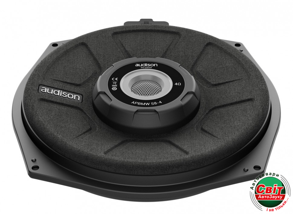 Сабвуфер Audison Prima APBMW S8-4Сабвуфер Audison APBMW S8-2 був спроєктований з такими електроакустичними параметрами, які максимізують продуктивність сабвуфера в штатному місці, розміщеному під сидіннями. Пластиковий кошик ABS, посилений скловолокном і акустична структура з переднім магнітом, забезпечують мінімальну глибину встановлення для ідеальної сумісності з усіма елементами інтер'єру автомобіля. Дві 5-мм поліуретанові прокладки, що входять до комплекту, дають сабвуферу ідеально вписатися в штатному об'ємі, захищаючи її від вібрації.