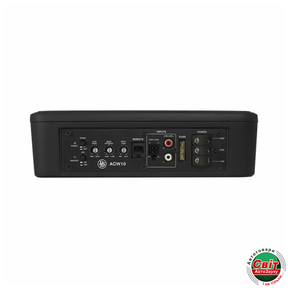 Сабвуфер DLS Reference ACW10Автомобільний сабвуфер DLS ACW10 - це високоякісний 10-дюймовий активний сабвуфер з неперевершеним, кришталево чистим і м'яким басом, прекрасно показує себе в ролі сабвуфера під сидіння. Сабвуферний динамік з дифузором з поліпропілену і незвичайним тисненням на ньому, і, звичайно, м'яким гумовим підвісом. Корпус з алюмінію вкритий порошковою фарбою, що робить його привабливим і досить міцним. Наявність високорівневого входу на ньому робить його більш практичним для встановлення в штатні акустичні системи, що не мають виходів RCA.