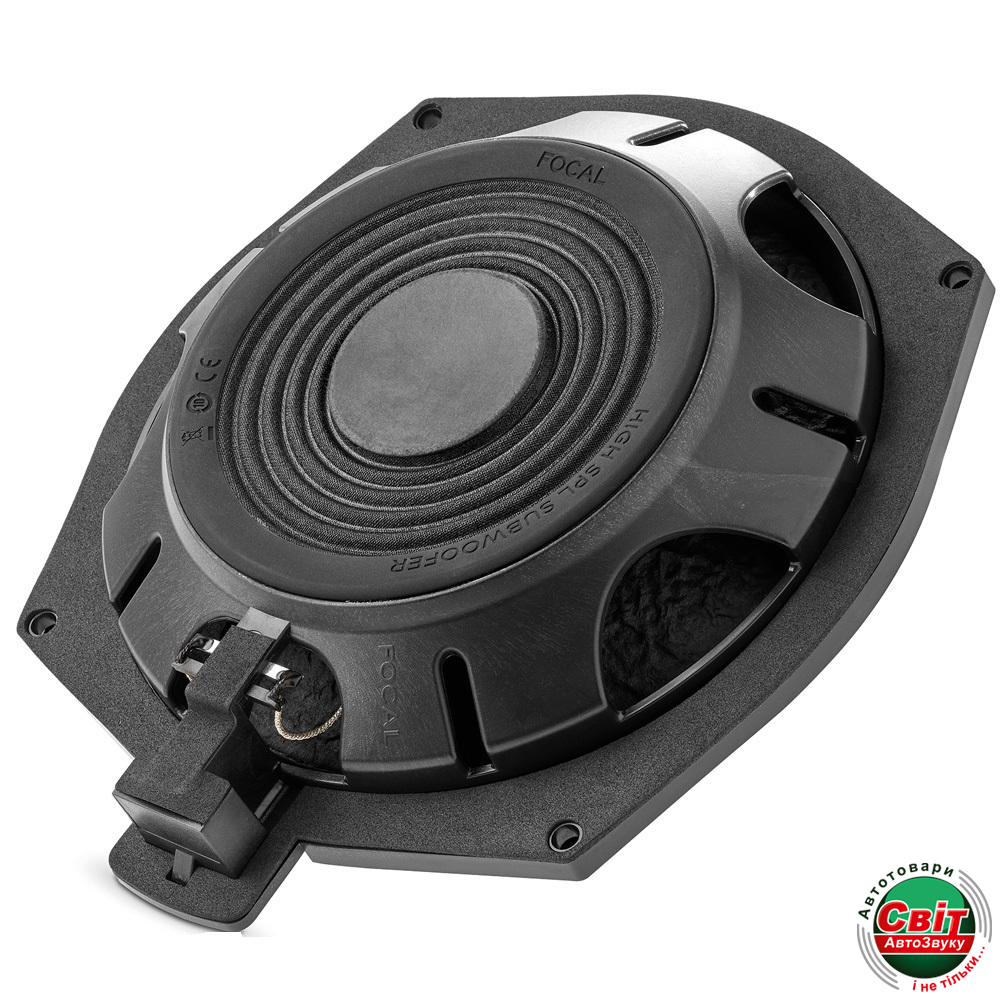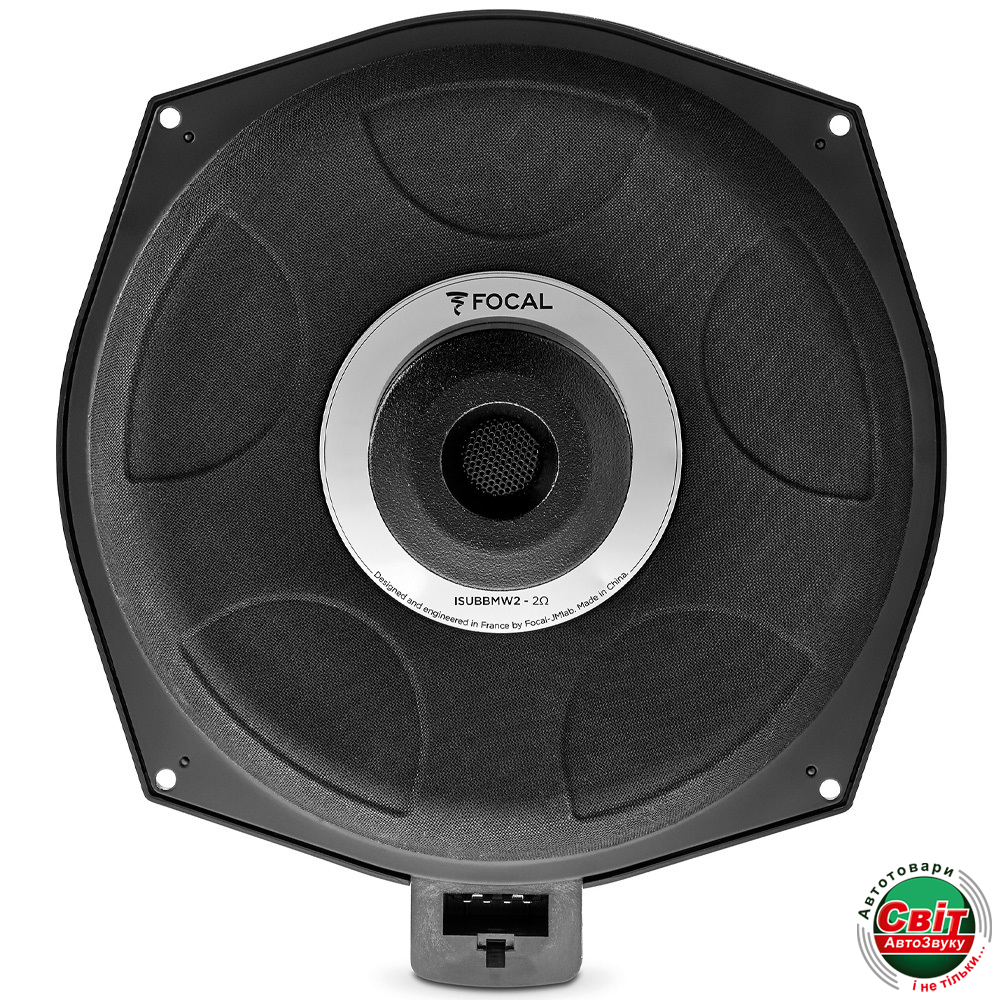 Сабвуфер Focal ISUB BMW 2Пасивний мідбас сабвуфер типорозміру 8 дюймів, призначений для використання в автомобілях BMW і Mini для встановлення під переднє водійське або пасажирське сидіння. FOCAL ISUB BMW 2 зроблений із використанням потужного неодимового магніту й особливого композитного дифузора, встановлених на литу алюмінієвий кошик, що в сукупності забезпечує максимально ефективне відтворення низьких частот без сторонніх звуків у всьому діапазоні гучності. Вирізняється дуже високою швидкістю і простотою встановлення, а також комплектується всіма необхідними монтажними аксесуарами. Номінальна потужність сабвуферного динаміка дорівнює 90 Вт за RMS, максимальна 180 Вт RMS, чутливість 83 дБ і опір 2 Ом, що необхідно враховувати під час узгодження динаміка з підсилювачем звуку.